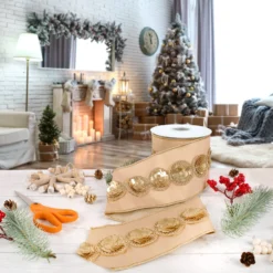 National Tree Company 4″ HGTV Home Collection Sequin Beaded Taffeta Ribbon, Beige