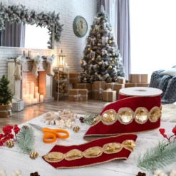 National Tree Company 4″ HGTV Home Collection Sequin Beaded Velour Velvet Ribbon, Burgundy