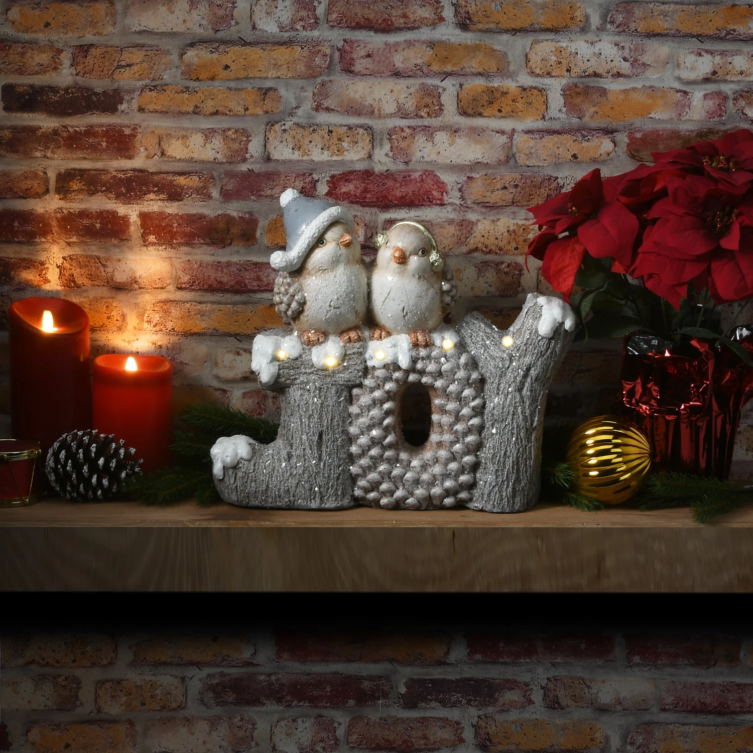 This whimsical decoration is constructed of strong polyresin material featuring handcrafted sculpting and hand-painted detail. Two birds in warm headwear are perched atop snow-dripping wood carved letters and a hollowed-out pinecone that together spell JOY. Five battery-operated warm white LED bulbs add a soft glow of light. This decorative piece will be a fun addition to your holiday trimmings.