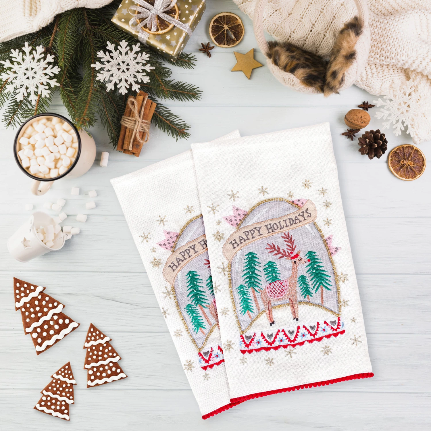 These decorative Christmas themed towels feature a large snow globe containing evergreen trees and a reindeer and is wrapped with a banner reading “Happy Holidays”. Metallic threads and gold beading add sparkle to the 100% cotton fabric trimmed with a complementing bright red piping edge. Add a seasonal splash to kitchen or bath with these fun and whimsical holiday hand towels.