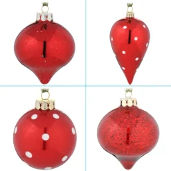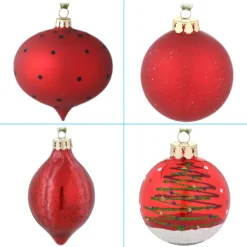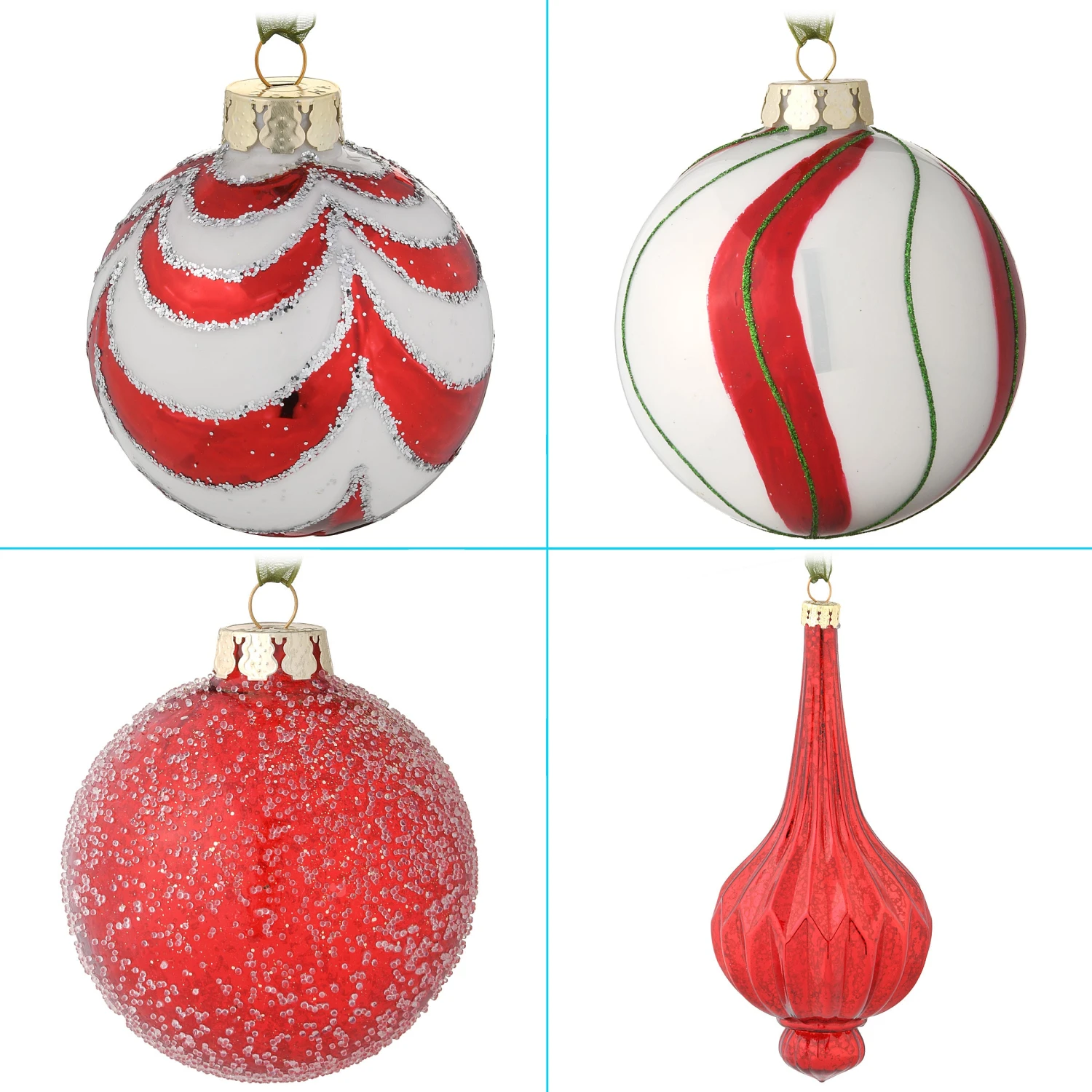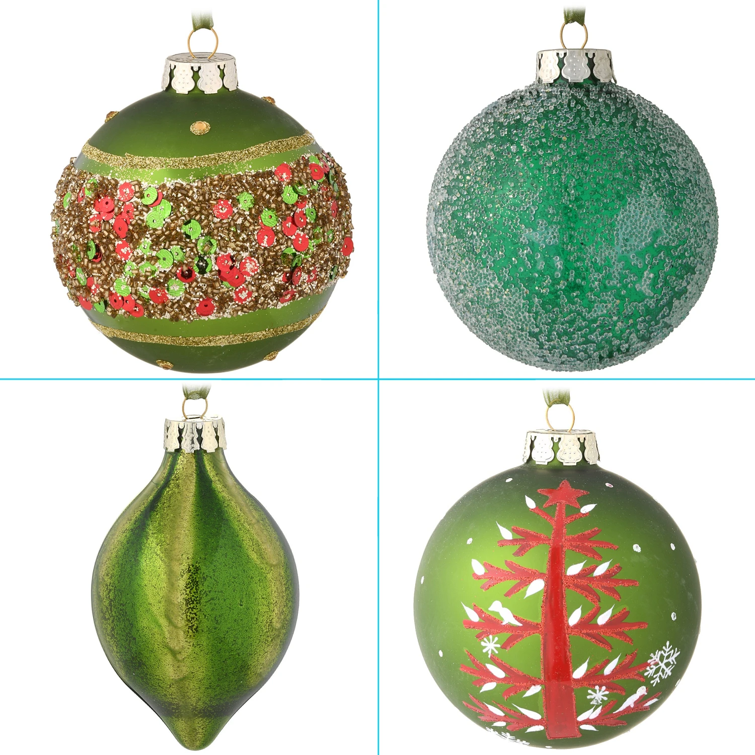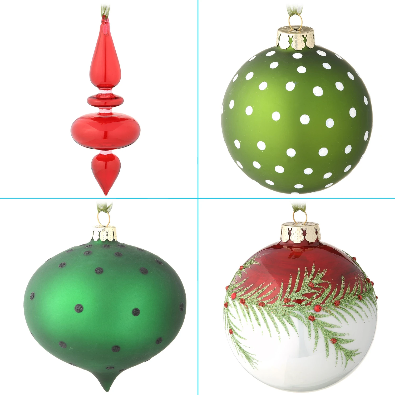 This set of 20 vintage-style blown glass ornaments feature a motif of bright and green Christmas colors in both gloss and matte finishes. Included are ball, spire, and ornate shapes many with hand-painted, glittered and, decorative embellishments. Each ornament includes a ribbon loop for hanging convenience. Boxed in white heavyweight cardboard with cushioned compartments, these beautiful ornaments will become a part of your holiday decorating for years to come.