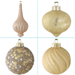 This set of 20 vintage-style blown glass ornaments feature a motif of attractive gold and silver colors in both gloss and matte finishes. Included are ball, teardrop, and ornate shapes many with decorative and glittered embellishments in glamorous styles. Each ornament includes a ribbon loop for hanging convenience. Boxed in white heavyweight cardboard with cushioned compartments, these beautiful ornaments will become a part of your holiday decorating for years to come.