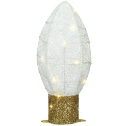 This unique holiday decoration is made with reinforced fabric material wrapped around a wire frame creating a strong and durable holiday trimming. It is designed to replicate the classic C7 style light bulb found exclusively on light strings from the early days of decorating. 25 long lasting warm white LEDs lights make it sparkle and shine. For display in indoor or outdoor locations. Battery operated.