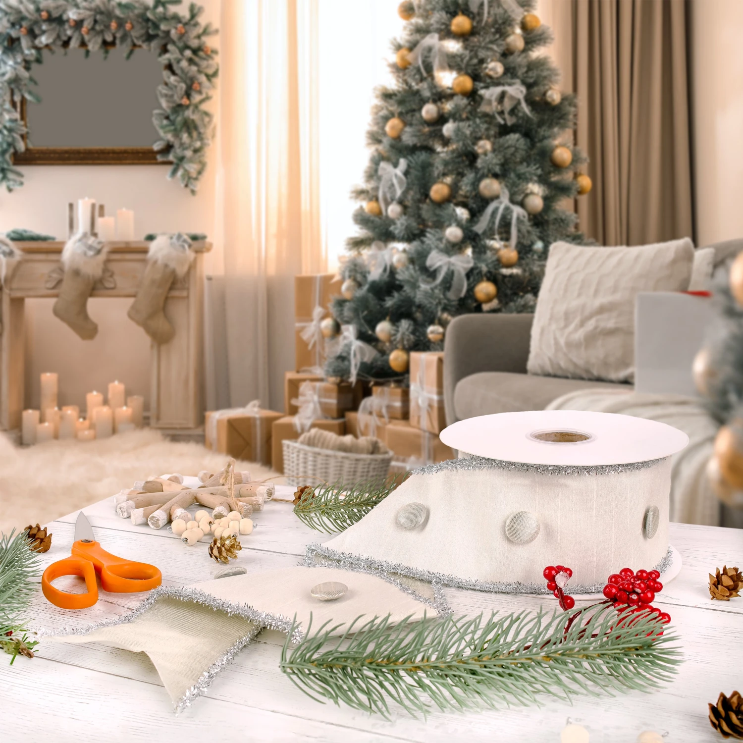 Show some creativity with this double-fused bright white fabric ribbon featuring a repeating button motif with wire and silver tinsel fringe edging. This versatile ribbon is perfect for holiday decorating, tree trimming, gift wrapping and other fun projec