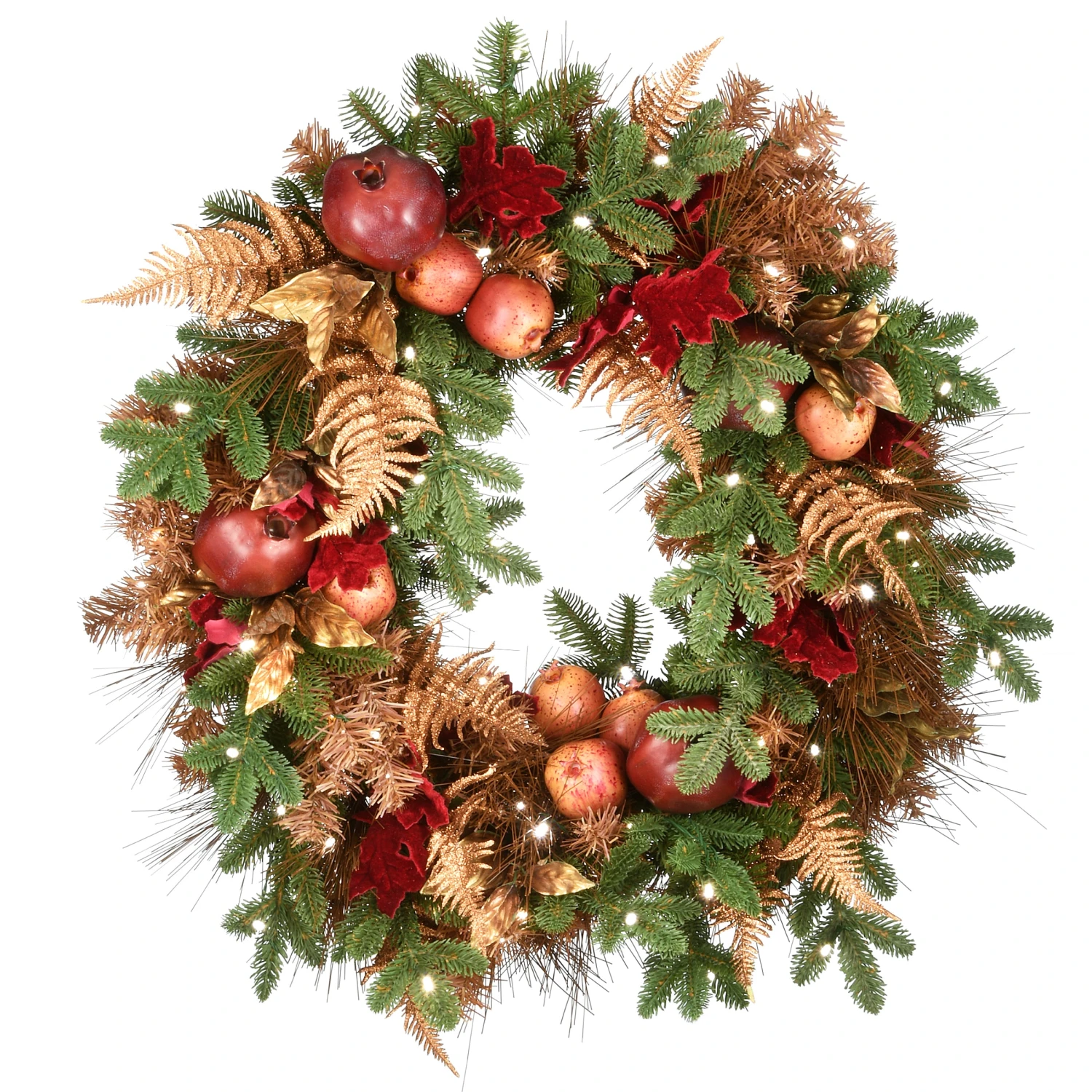 This decorated wreath features a mixture of evergreen and bristle tips trimmed with red and gold leaves, fern fronds and assorted red apples. It is pre-strung with 100 battery-operated warm white LED lights that are energy-efficient and long lasting. Included is an option for 6 hours ON/18 hours OFF timed operation. Also included is a convenient handheld remote to control the lights. This attractive harvest wreath can be displayed on doors, walls, and windows in indoor or covered outdoor locations.