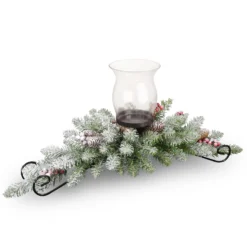 This Centerpiece features a spray of evergreen branches with red berry and pine cone trimming, all covered in a sprinkling of soft snow. Black painted steel base is topped with a candle plate that fits a single pillar style candle. Decorative glass enclosure is included. Display this decoration in indoor or covered outdoor locations.