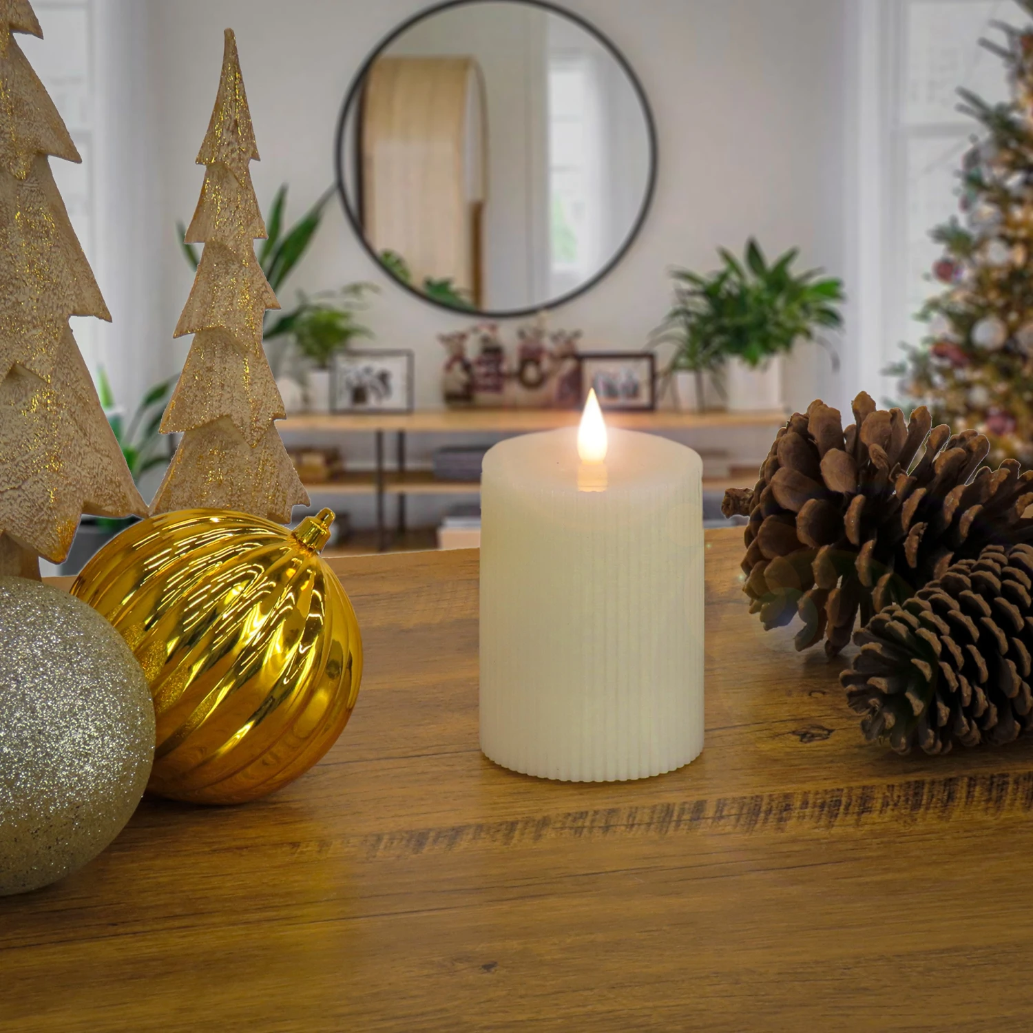 Battery operated with remote controlled functions, this flameless candle produces a realistic, soft, and safe candle glow. The exterior surface is crafted with real wax and features an elegant vertical ridged design in an attractive ivory finish. A handheld remote control operates the lifelike candle flame with functions that include brightness, flicker speed, and timer settings. Uses two C size batteries (not included).