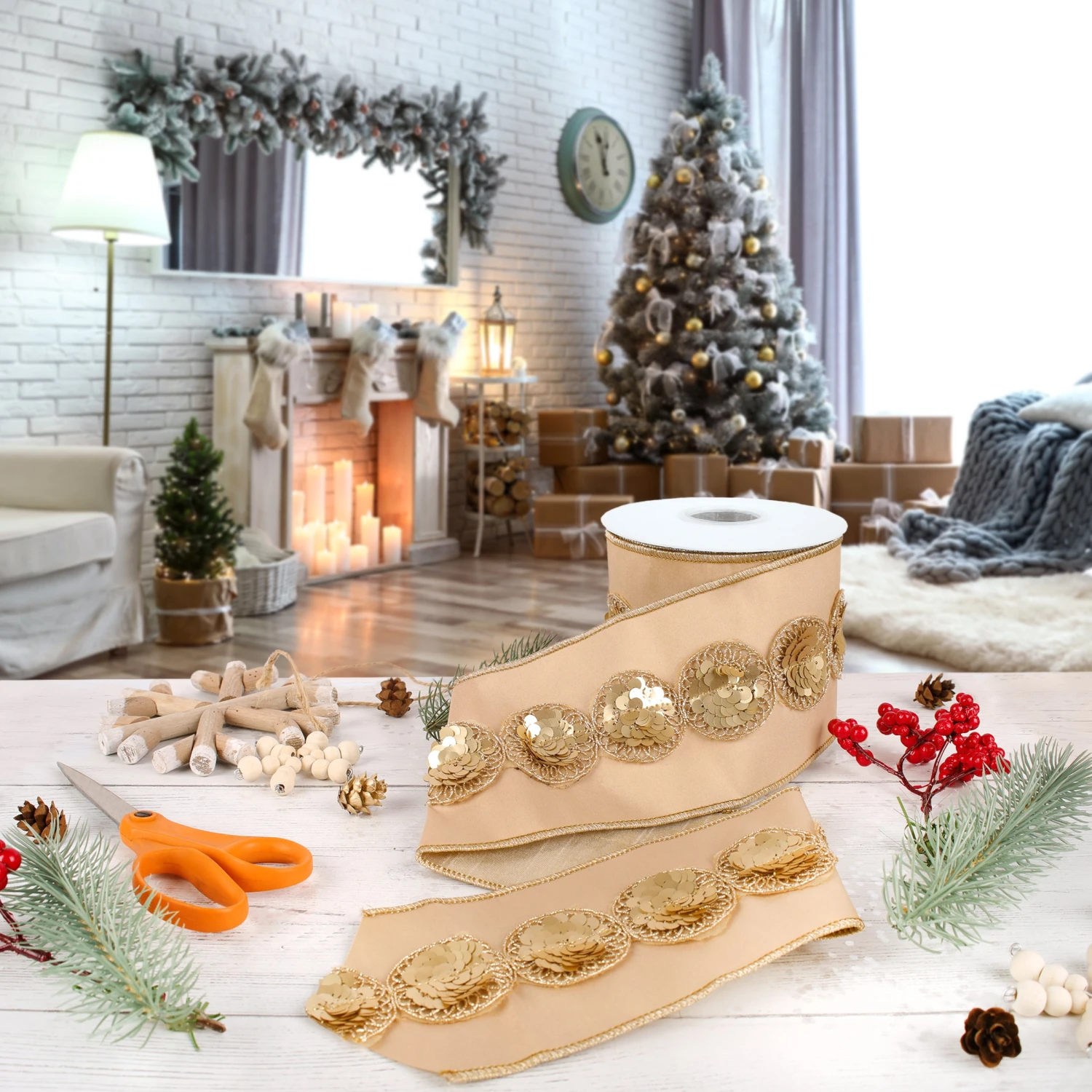 Show some creativity with this sparkling ribbon featuring a repeating pattern of ornately stitched and beaded medallions. This unique and versatile ribbon with flexible wire borders is perfect for holiday decorating, tree trimming, gift wrapping and other