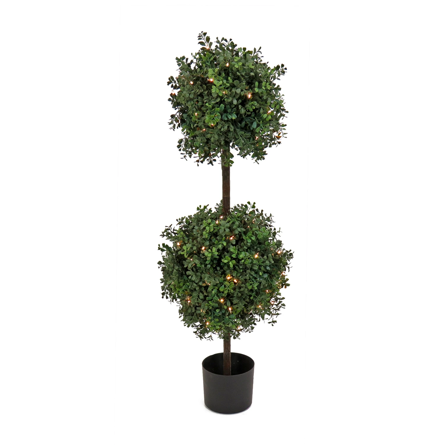 Add a splash of greenery to areas in or around your home with this artificial Boxwood double ball topiary. Featuring thick groups of life-like branches and pre-strung with 100 clear lights, it is firmly seated in a sturdy matte black nursery pot. This tree appears to be living yet requires none of the maintenance, water, or sunlight of a living plant. Display along walkways, on porch, patio, or entranceways. For indoor or outdoor use.