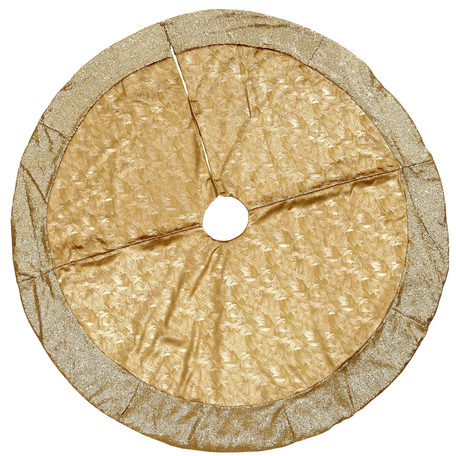 Add a stylish and vibrant finishing touch to your Christmas centerpiece with this bright and shiny tree skirt. Made of 100% polyester, this skirt features a brushed gold metallic motif and wide gold border dotted with glittering sequins. The split seam design allows for easy placement with Velcro tabs included to close and secure the seam.