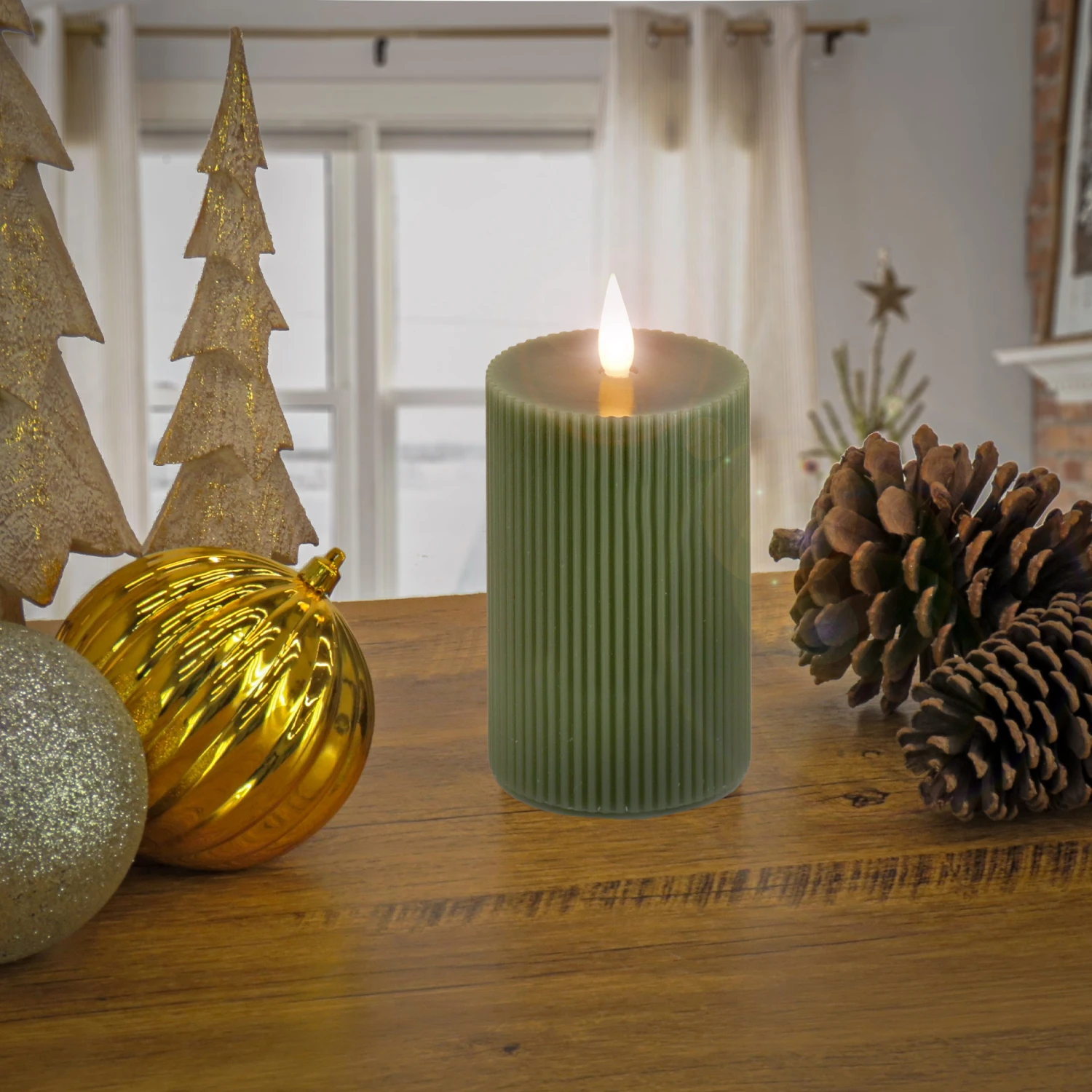 Battery operated with remote controlled functions, this flameless candle produces a realistic, soft, and safe candle glow. The exterior surface is crafted with real wax and features an elegant vertical ridged design in an attractive dark green finish. A handheld remote control operates the lifelike candle flame with functions that include brightness, flicker speed, and timer settings. Uses two C size batteries (not included).