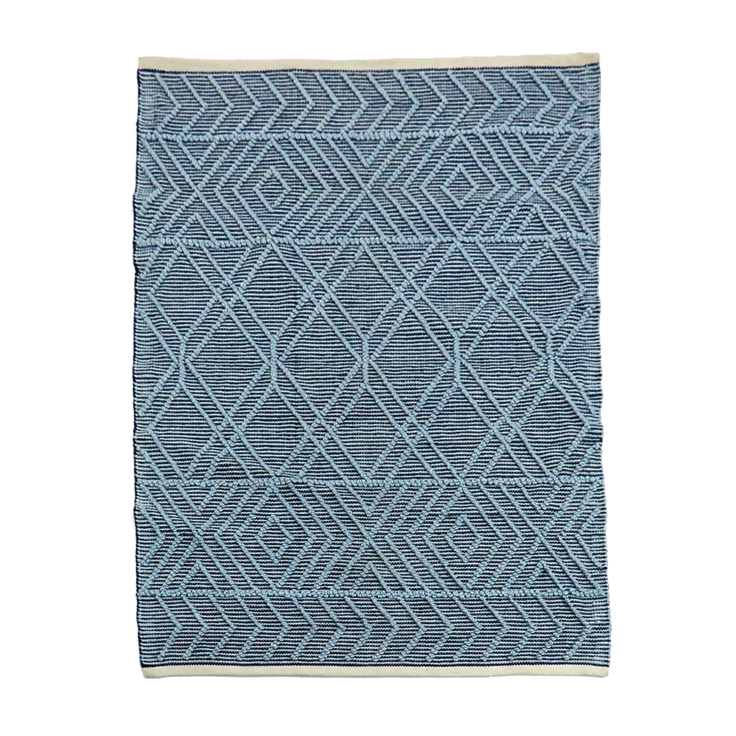 This attractive indoor/outdoor area rug is constructed of 100% polyester that is stain and fade resistant and designed to endure outdoor environments. Handwoven with navy blue threads and featuring a braided geometric pattern, this floor covering will provide a soft texture while at the same time protecting the floor beneath. Durable and suitable for high-traffic areas, this rug will easily dress up interior or exterior spaces, perfect for porch, patio, family room or foyer.