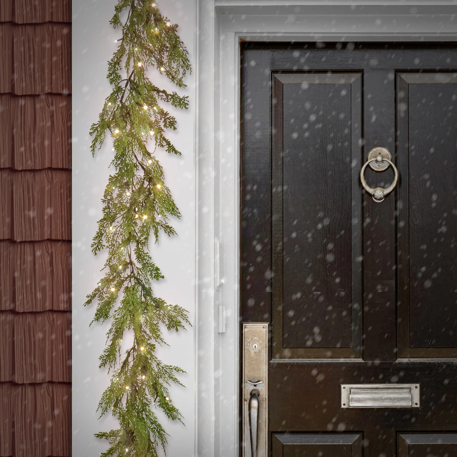 This decorative garland features long leafy cedar branch tips flowing from a flexible vine base. Branches are trimmed with pinecones for added natural appeal. It is pre-strung with 60 warm white LED lights that are energy-efficient and long lasting. Display this garland over door, window, fireplace mantel, or stairway railing in indoor or covered outdoor locations.