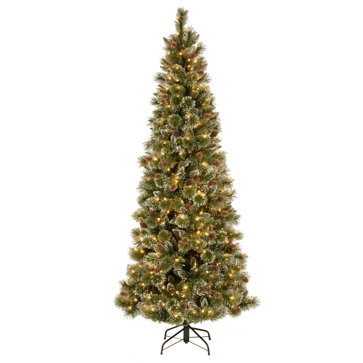The Glittery Bristle Pine is a mixed branch tree with sparkled bristle and white-tipped pine cones. It features the PowerConnect(TM) through-the-pole lighting system that eliminates the need for connecting multiple light strings, reducing set up time. The slim profile is great for display in areas with limited floor space. It is pre-strung with 500 Dual Color® lights that change from warm white to multicolor with the touch of a button. The bulbs are low voltage LEDs that are energy-efficient and long lasting. Included is a foot pedal switch to control 10 different light colors and actions. Hinged branch construction makes assembly quick and easy.