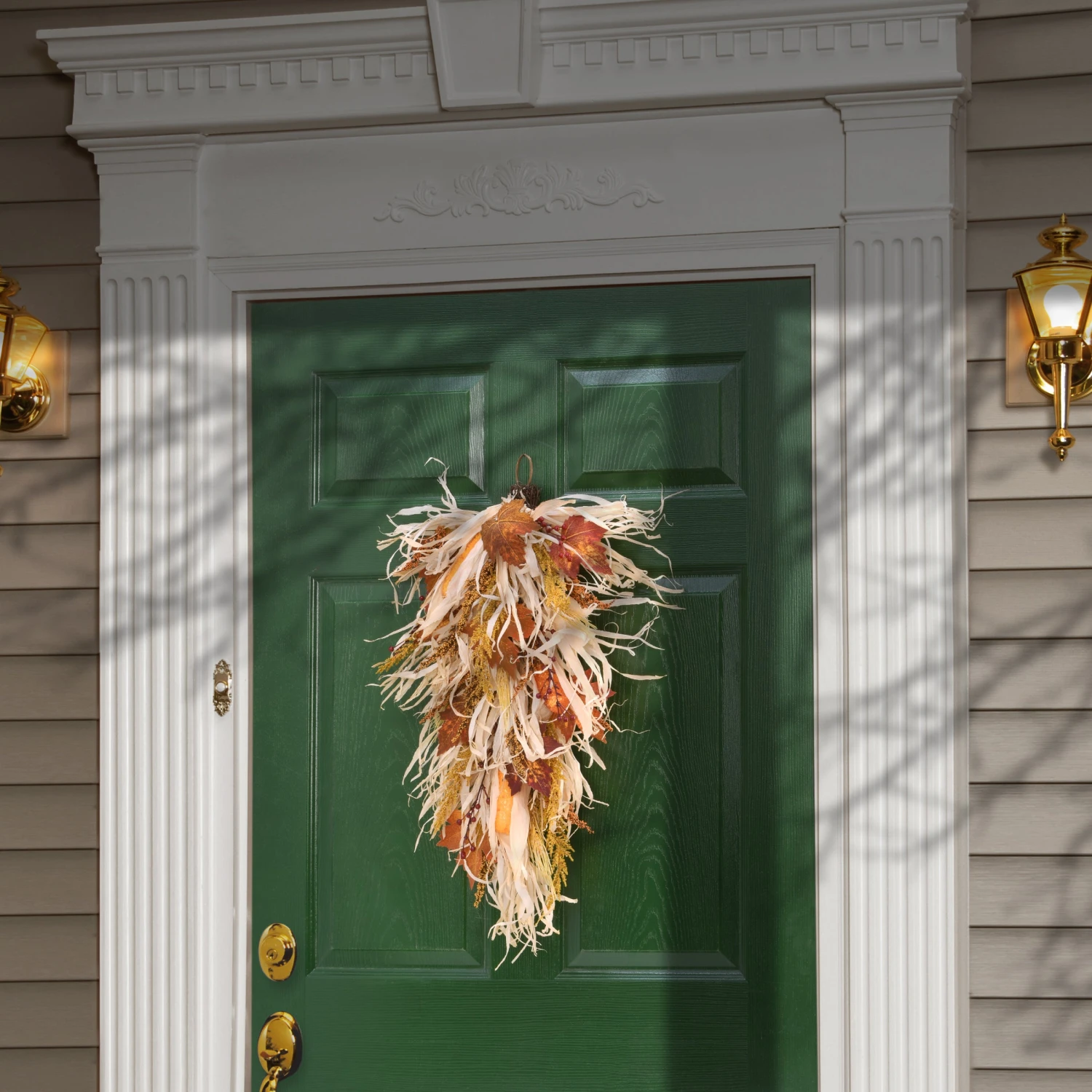 Welcome the fall season through your front door or window display with National Tree Company’s Artificial Autumn Hanging Teardrop Decoration. Designed with a woven branch base, this teardrop is 30 inches long and decorated with corn husks and berry cluste