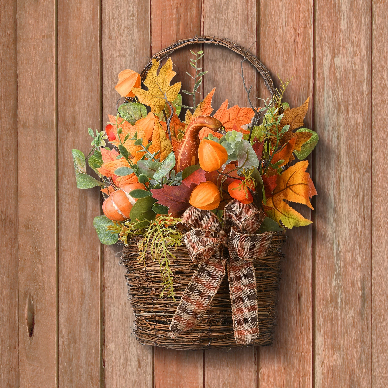 - Durable, fire-resistant and suitable as an indoor or covered outdoor autumn decoration, this hanging wicker basket wall decoration is designed to endure the fall season year after year.