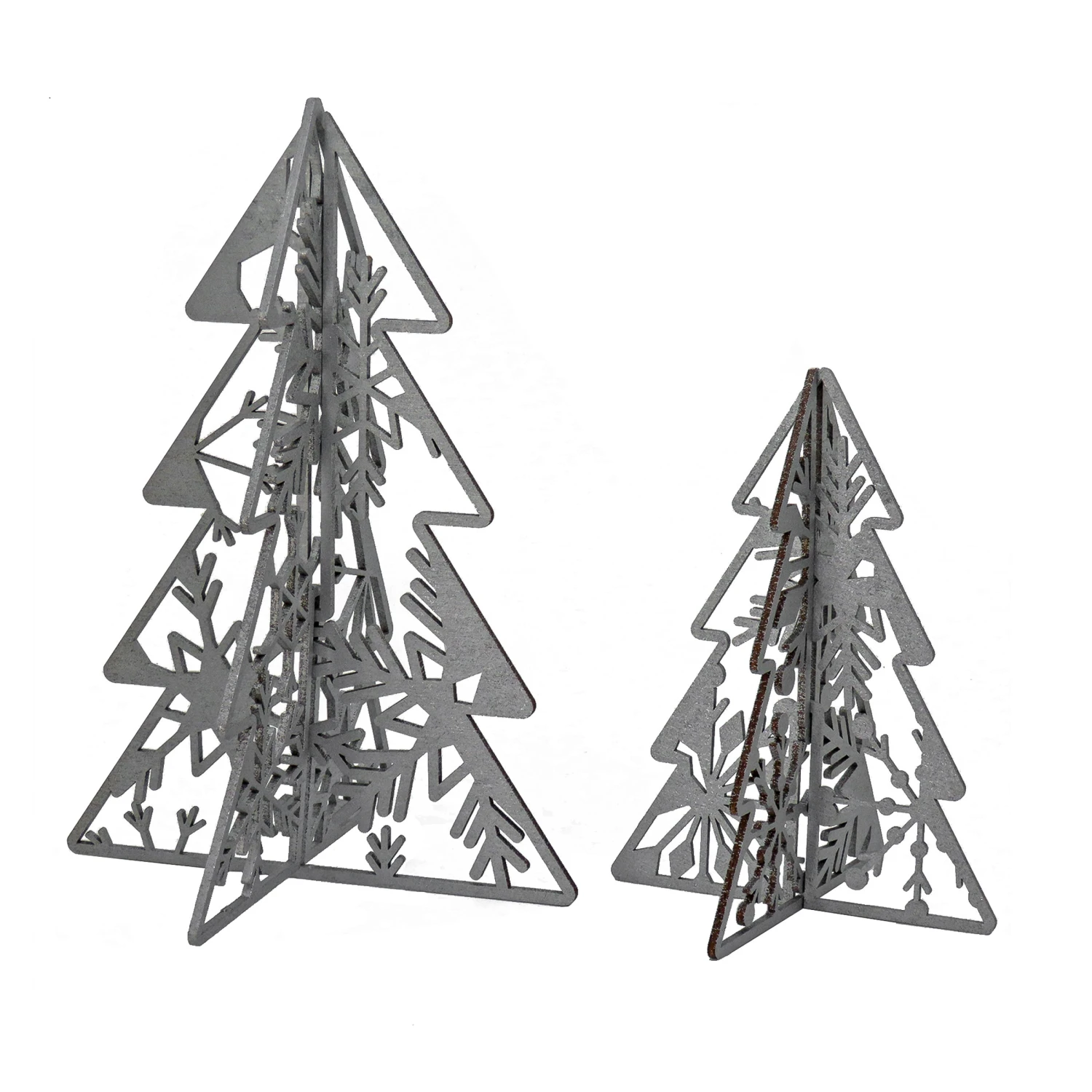 Ornate and eclectic, these custom cut tabletop decorations feature a motif of assorted snowflake designs inside an evergreen tree form. They are constructed of lightweight wood with a silver painted finish that comes in two pieces that slide together. The