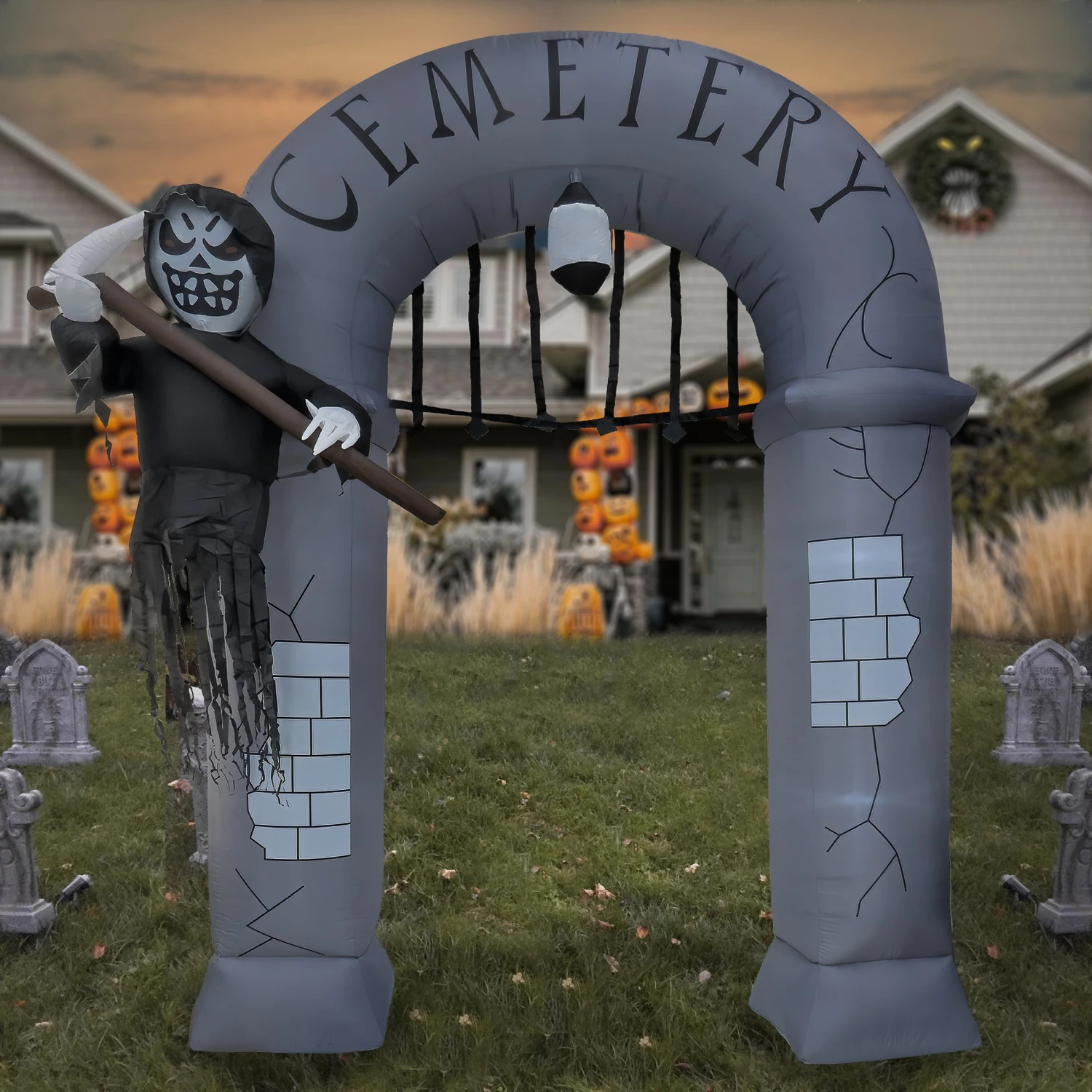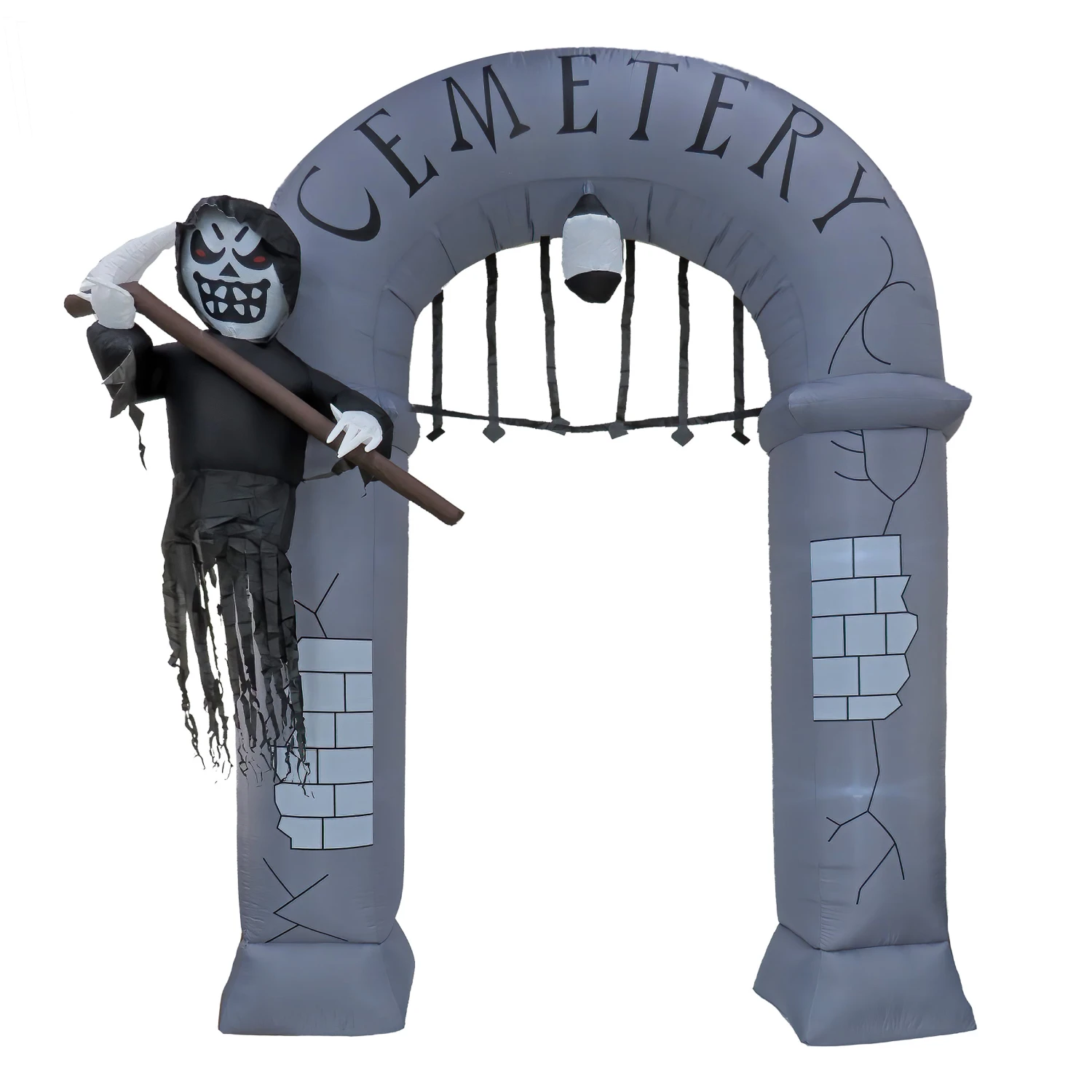 Hear the cries and screams as your Halloween visitors have to endure the walk of horror to your door under this 12ft Inflatable Halloween Ghost Arch. Standing at a souring 12ft tall, this polyester inflatable arch includes a ghost holding it’s scythe with the word “Cemetery” written across the top. Features four White LED lights. Add this to your front lawn decor to impress your Halloween neighbors and guests.