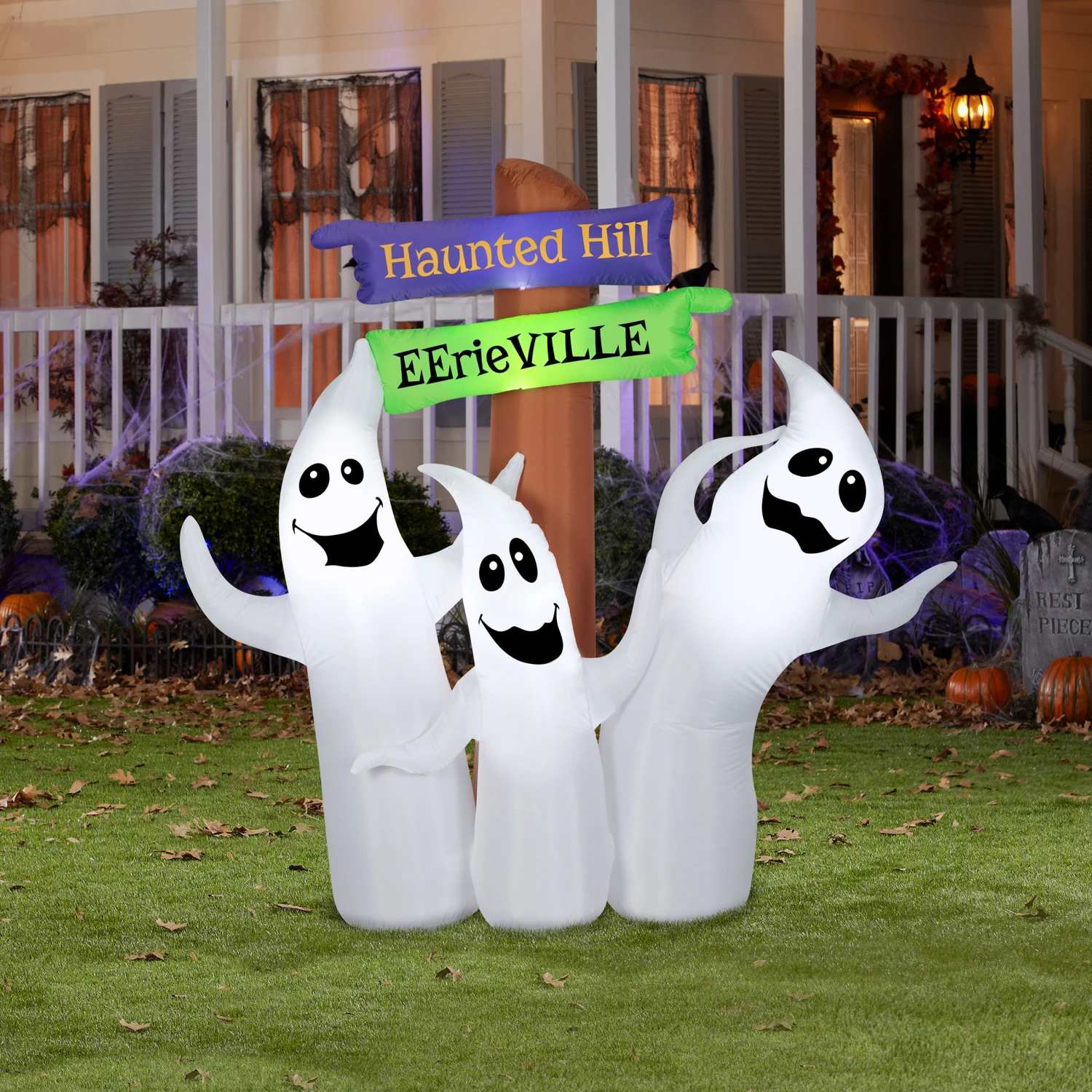 Entertain neighbors and guests with this light-up Airblown® inflatable decoration. Happily waving, these three ghosts with silly smiles will add a touch of humor to your Halloween decorating. Behind them is a signpost with directions to both Haunted Hill