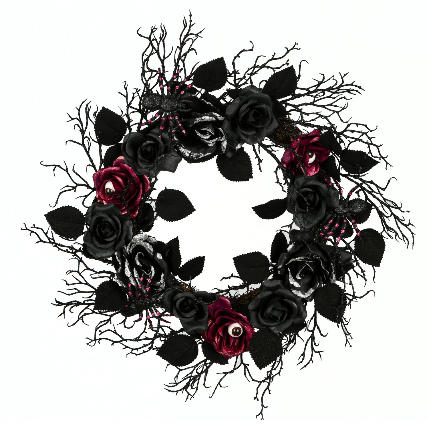 - This harrowing Halloween wreath decoration is decorated with an assortment of black rose blooms sprinkled with silver glitter, black spiders and a flowing mix of black leaves and twigs