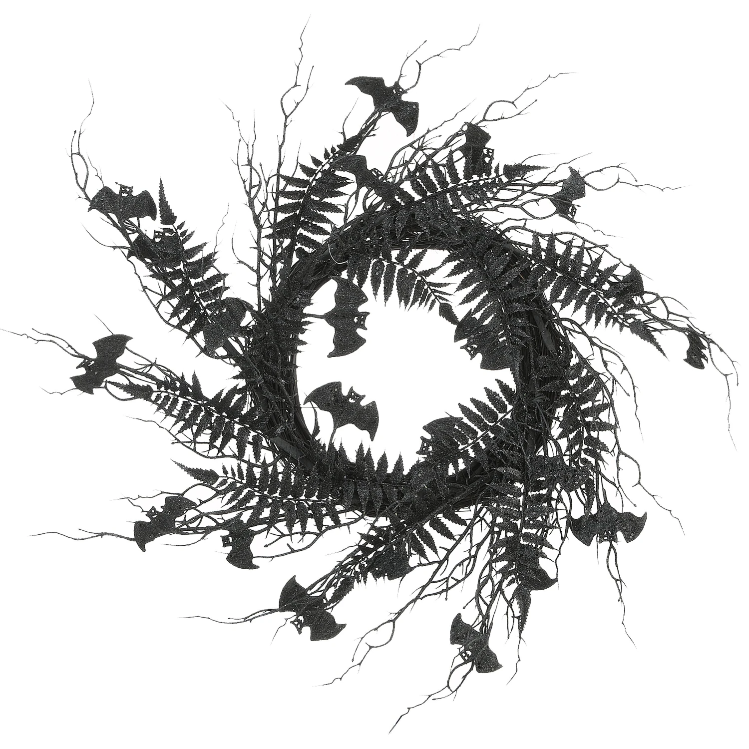- Halloween-themed wreath made with a woven black branch base and decorated with miniature bats. The arrangement is supplemented with black fern leaves and twigs.