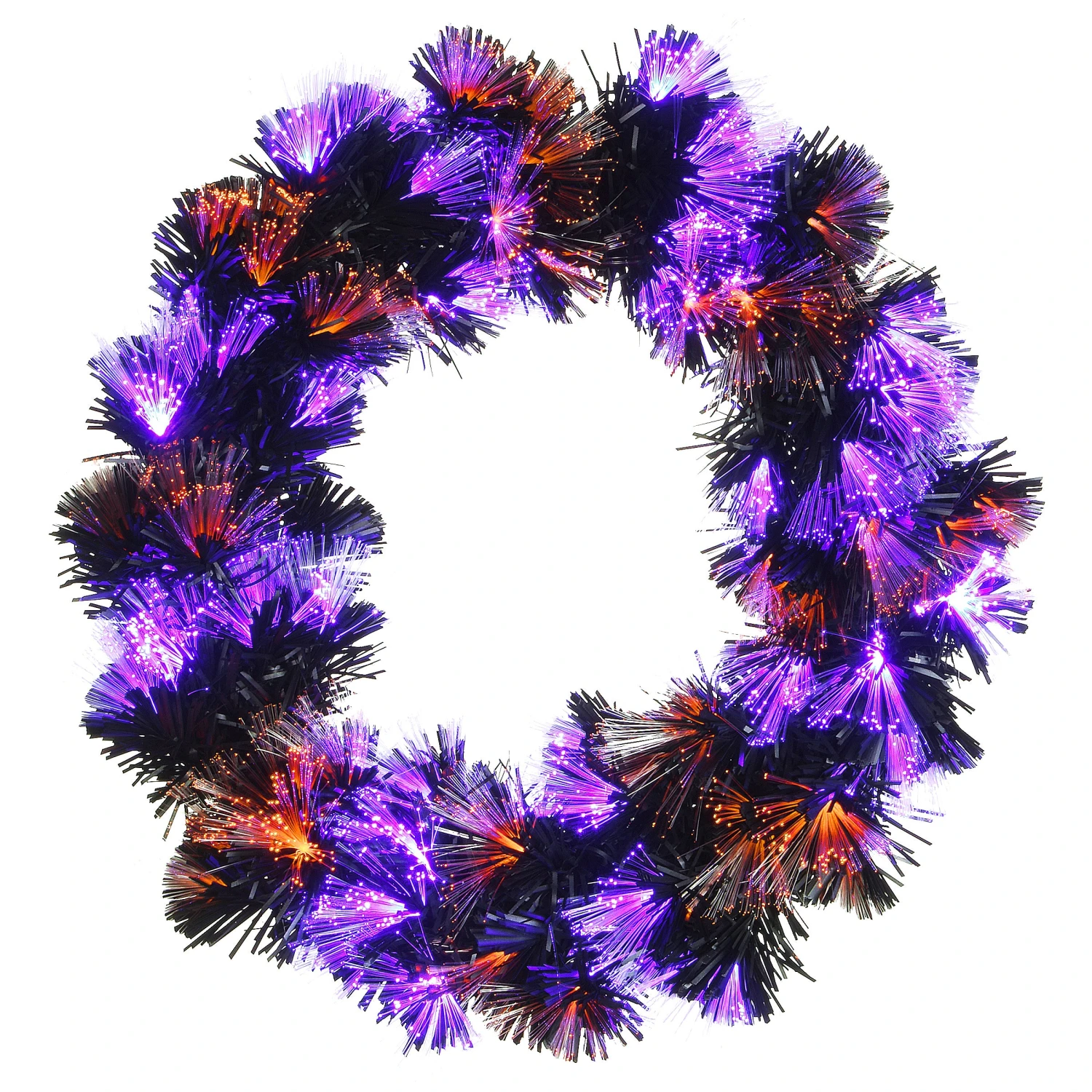 - Halloween-themed wreath made with a woven black branch base and decorated with 80 orange and purple fiber optic branch tips. The arrangement is supplemented with purple and orange lights that illuminate the branches.