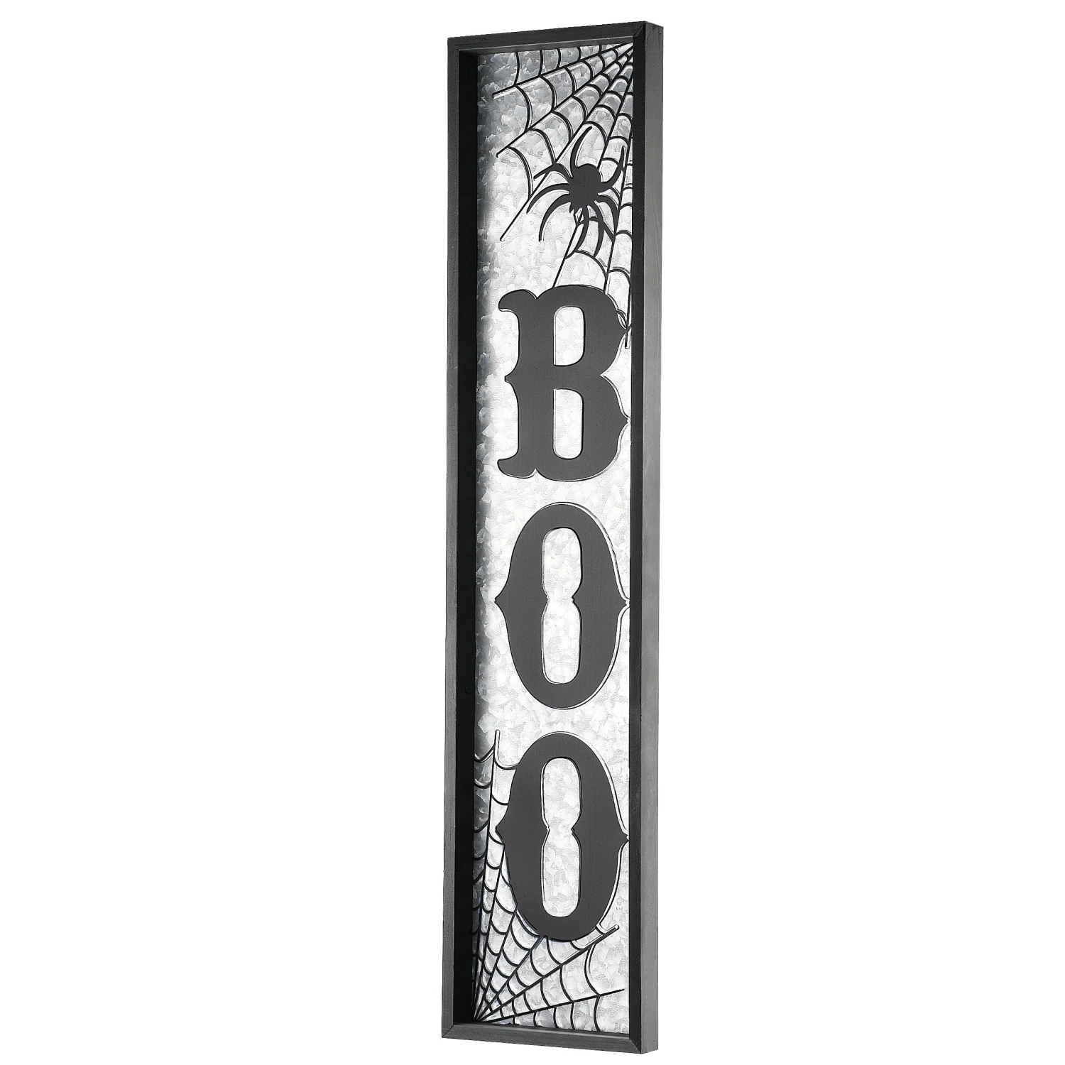 Transform your home into the scariest house in the neighborhood with National Tree Company’s BOO wall sign decoration. This 42 inch wooden plaque features a spider hanging out on large cobwebs. On a tasteful gray backdrop, the message “BOO” adorns the sig