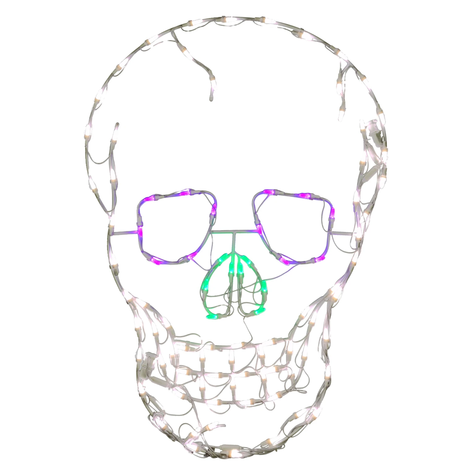 - The decoration depicts a frame shaped in the outline of an eerie skull. The lights attached glow brightly in a combination of purple, white and green bulbs. To power the lights, simply plug into the nearest wall outlet
