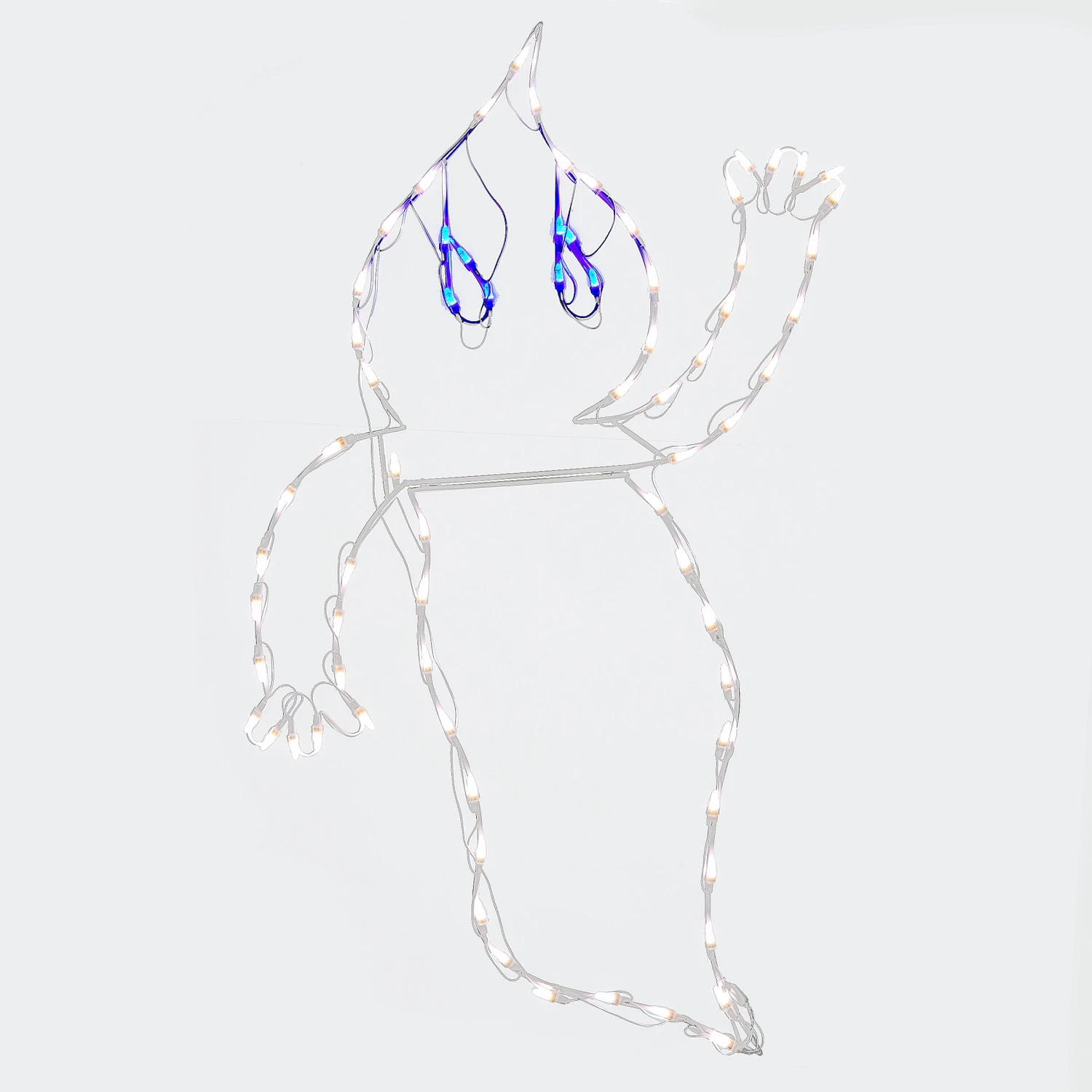 - The decoration depicts a frame shaped in the outline of a waving ghost. The lights attached glow brightly in a combination of white and blue bulbs. To power the lights, simply plug into the nearest wall outlet