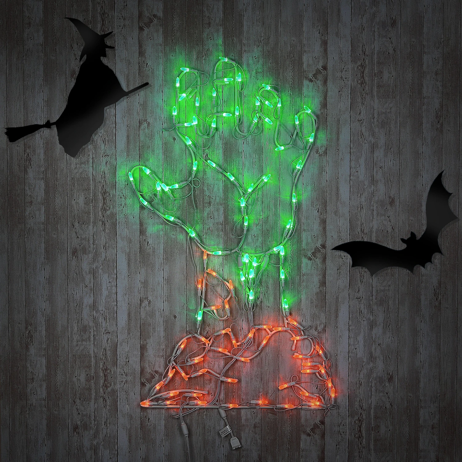 - Includes one Zombie Hand Lighted Sign Decoration that measures 36 inches in height and 41 inches in width and includes a total of 140 LED lights wrapped around a wire frame