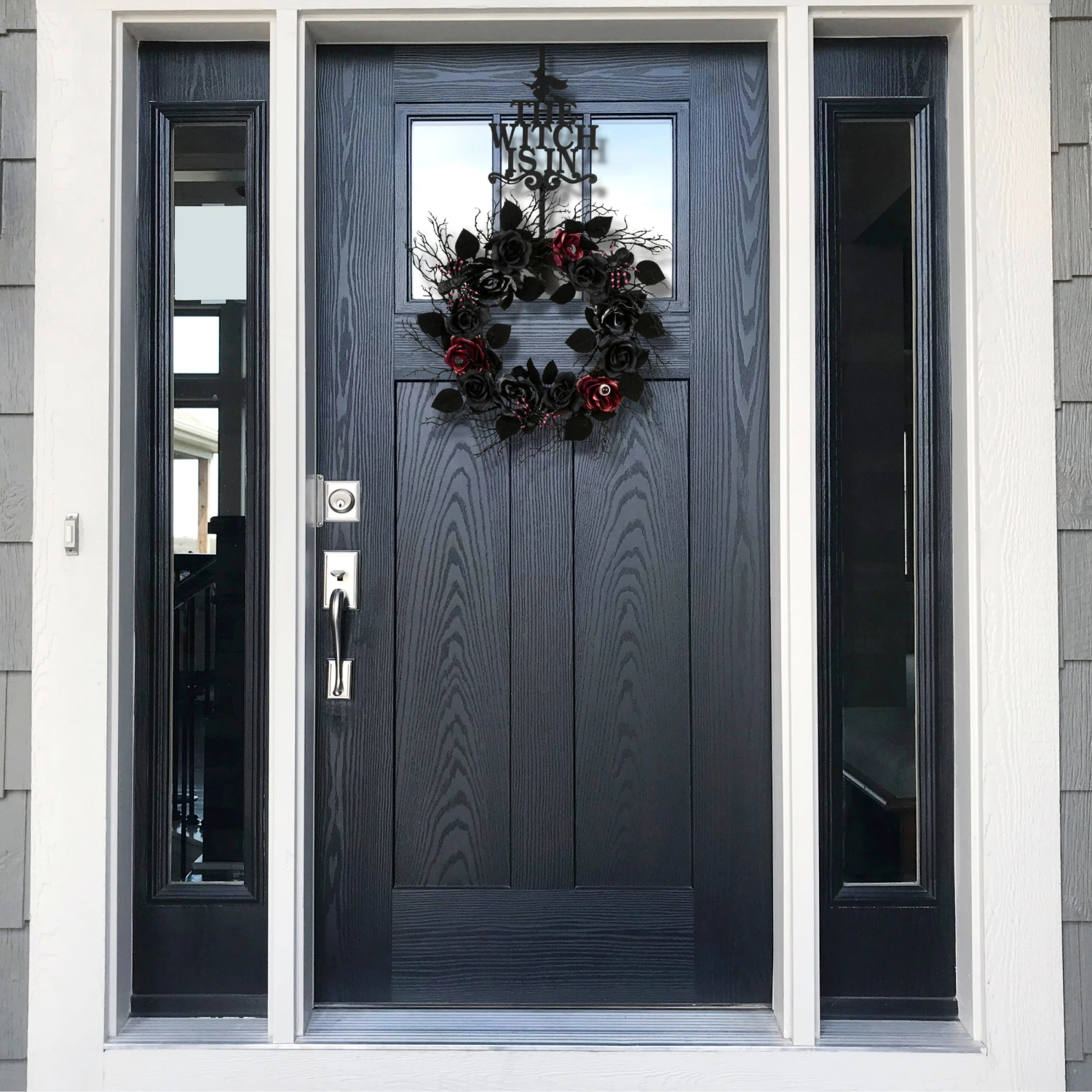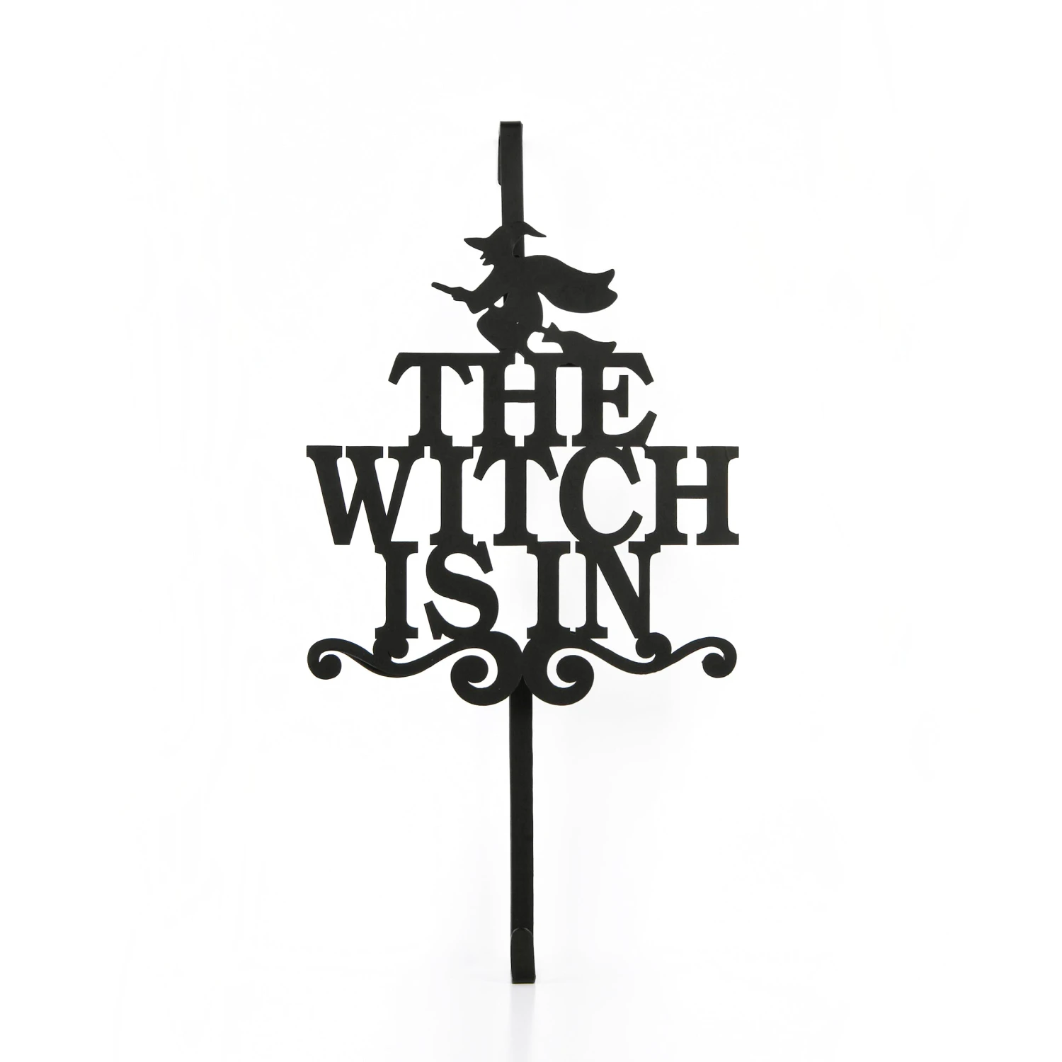 - This wreath hanger is painted with a matte black finish and features the message, ‘The Witch Is In’ that rests above the wreath