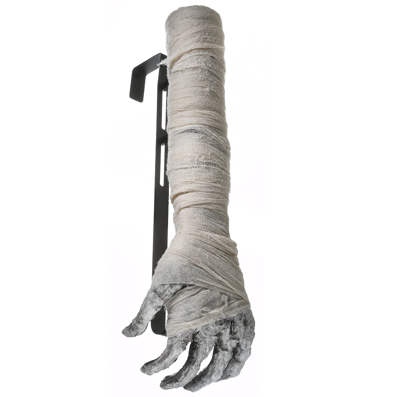 - Halloween-themed wreath hanger made to resemble a mummy’s hand holding the wreath. The zombie’s arm is covered with frayed, white fabric and has pale, dirty skin poking through the holes of the fabric.