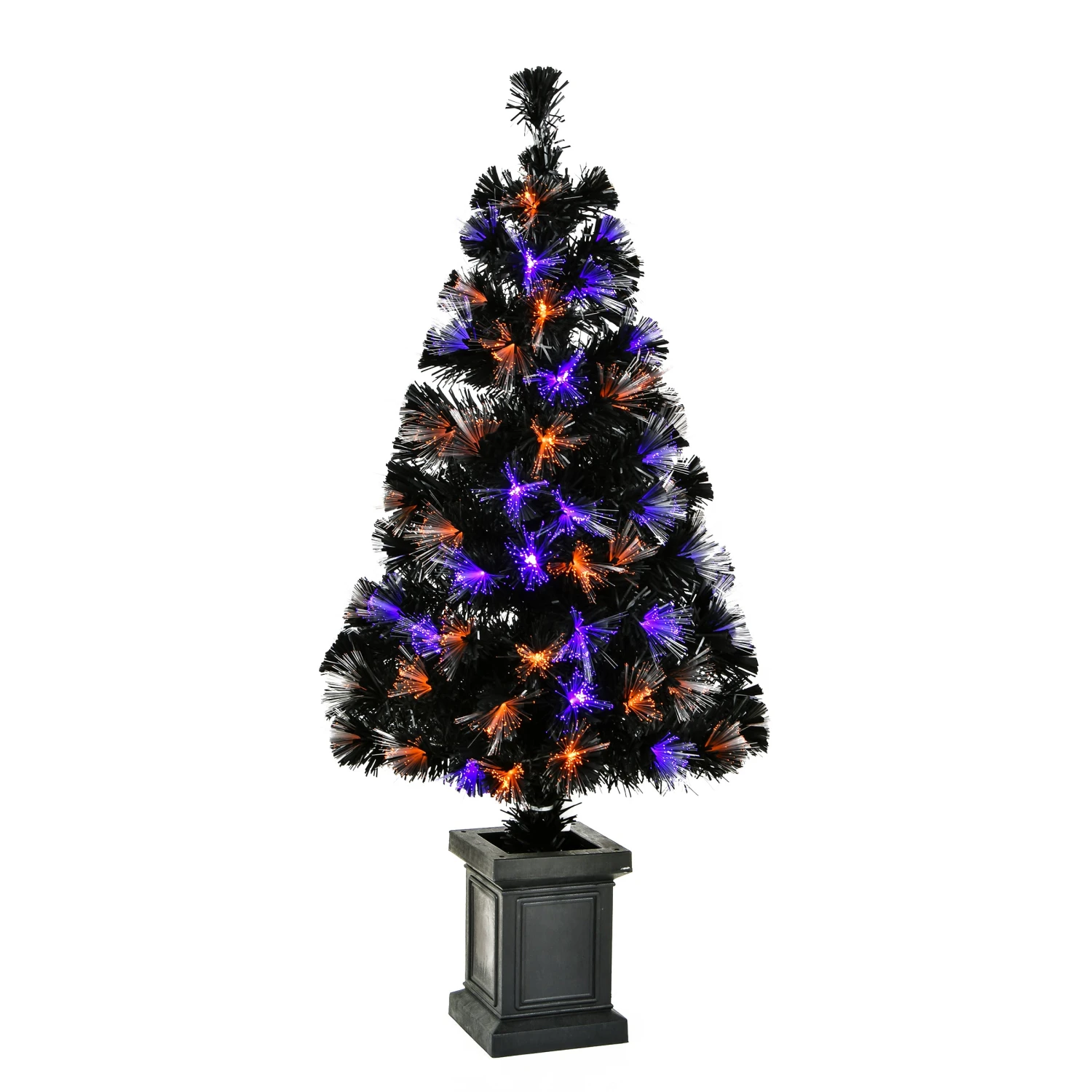 - Includes one Pre Lit Artificial Tree Decoration that measures 4 feet in height and 2 feet in diameter at the base and features 125 branch tips with purple and orange fiber lights
