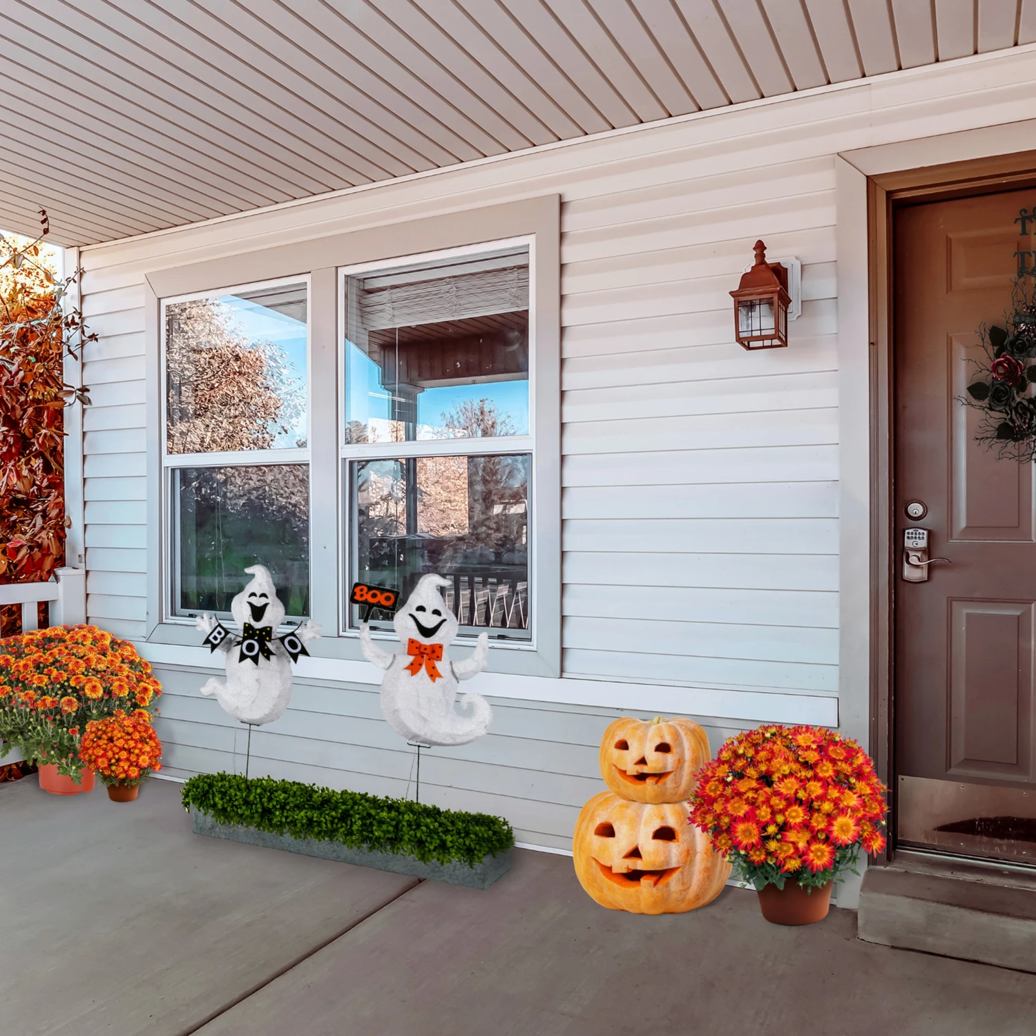 - Includes one Pre Lit Ghost with ‘BOO’ Sign Decoration that measures 15 inches in length, 3 inches in width and 31 inches in height and lit from inside with 30 LED lights