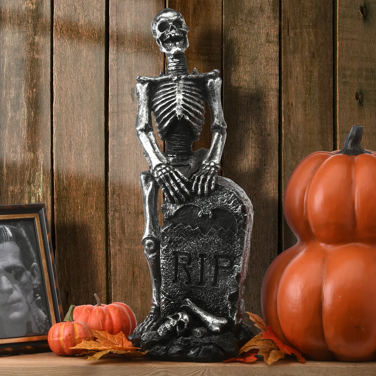 - Halloween themed decorative statue depicting a laughing skeleton standing behind a gravestone. The gravestone is inscripted with an RIP message and a bat.