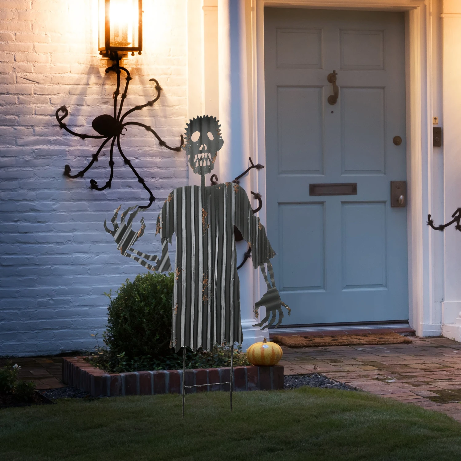 - Halloween themed outdoor decoration depicting a zombie silhouette with bony arms.