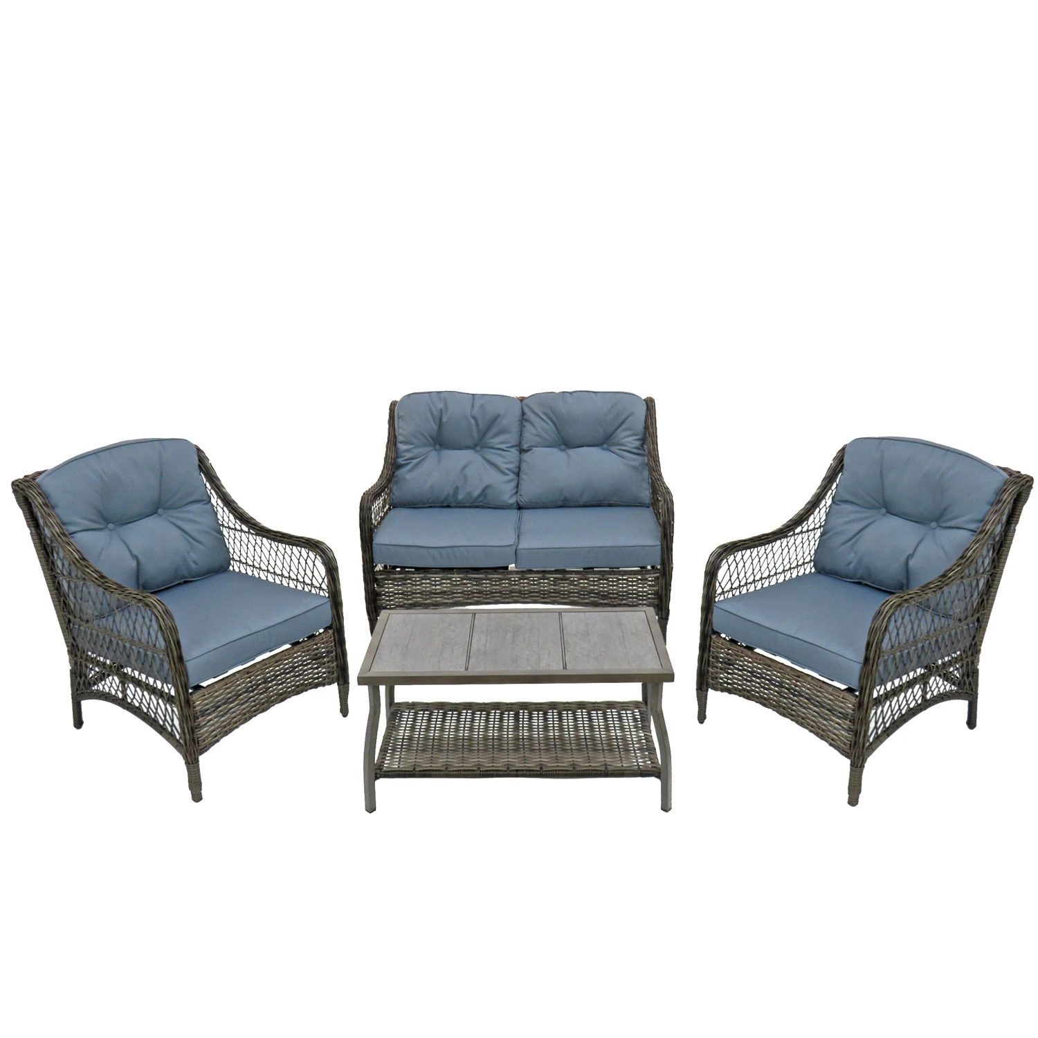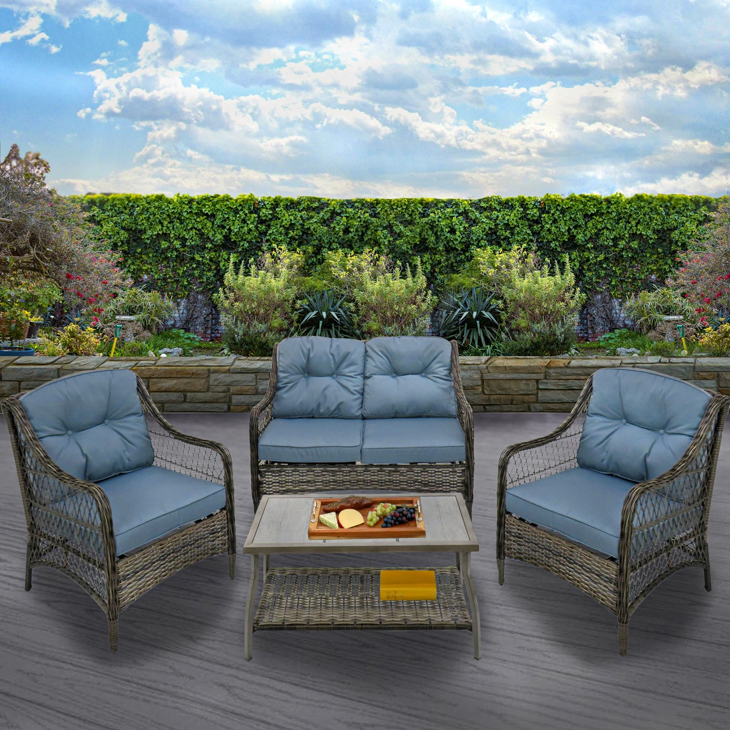 This indoor/outdoor chat set is constructed with strong aluminum framing wrapped in all-weather PE rattan-wicker material that is durable and long lasting. Each piece features a combination of wicker weave and wicker net styling in gray colors, all designed to withstand harsh outdoor elements. Pieces will not unravel, fray, or fade. Both chairs and loveseat have armrests and all three include comfortable, complementing removable gray cushions that are fashioned with water, mildew, and fade-resistant fabric. A sturdy, matching two-tier table with a tiled top surface completes the set. Pieces are easy to maintain and care for. Some assembly required.