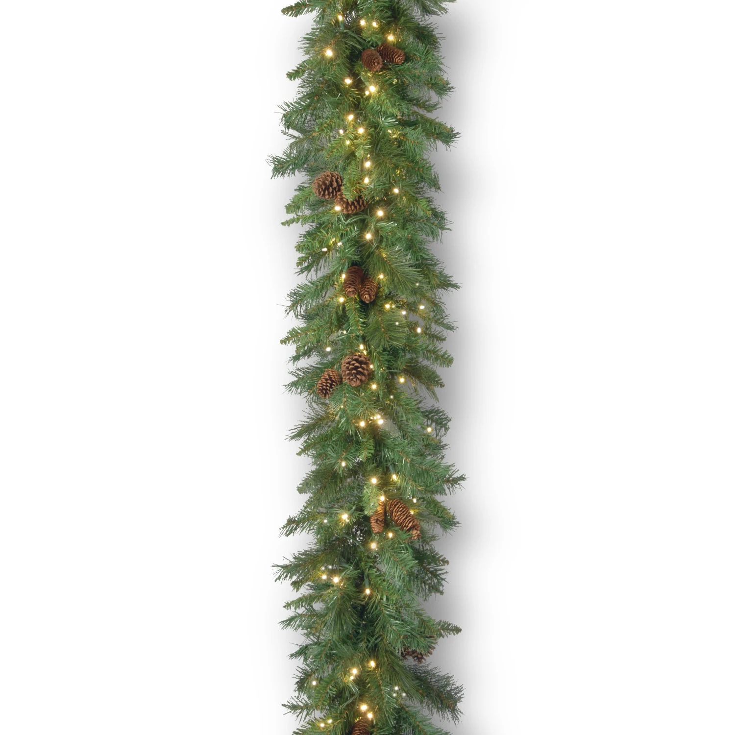 Transform your home for the winter holidays with National Tree Company’s Pre-Lit Artificial Christmas Garland. Designed with a Garwood Spruce branch base, this garland is 9 feet long and decorated with pine cones. These beautifully ornate decorations complement the garlanda???s natural looking branches. Made to look and feel lifelike, the stunning realism of the tree is defined by its close attention to detail, featuring tens of individually crafted branch tips that create a full bodied garland. This fantastically festive garland is strung with white UL lights prior to packaging for a more convenient setup. The lights operate individually, so if the bulb lens has not been cracked or broken, the light set will continue to illuminate except for any individual bulbs that are not working. To power the lights, simply plug them into the nearest outlet and let the pre strung lights illuminate your home with the warmth and cheer of the holiday season. Hang this decorative garland over any door, window or mantle to bring a Christmas ambience into any room or covered porch. Constructed with sturdy, high quality materials and hypo-allergenic, fire-resistant needles, this tree is built to bring holiday cheer for years to come. This hanging decoration is suitable for both indoor and covered outdoor use. At National Tree Company, we strive to create high quality Christmas decorations to help you transform your home so you can keep making every holiday moment magical.