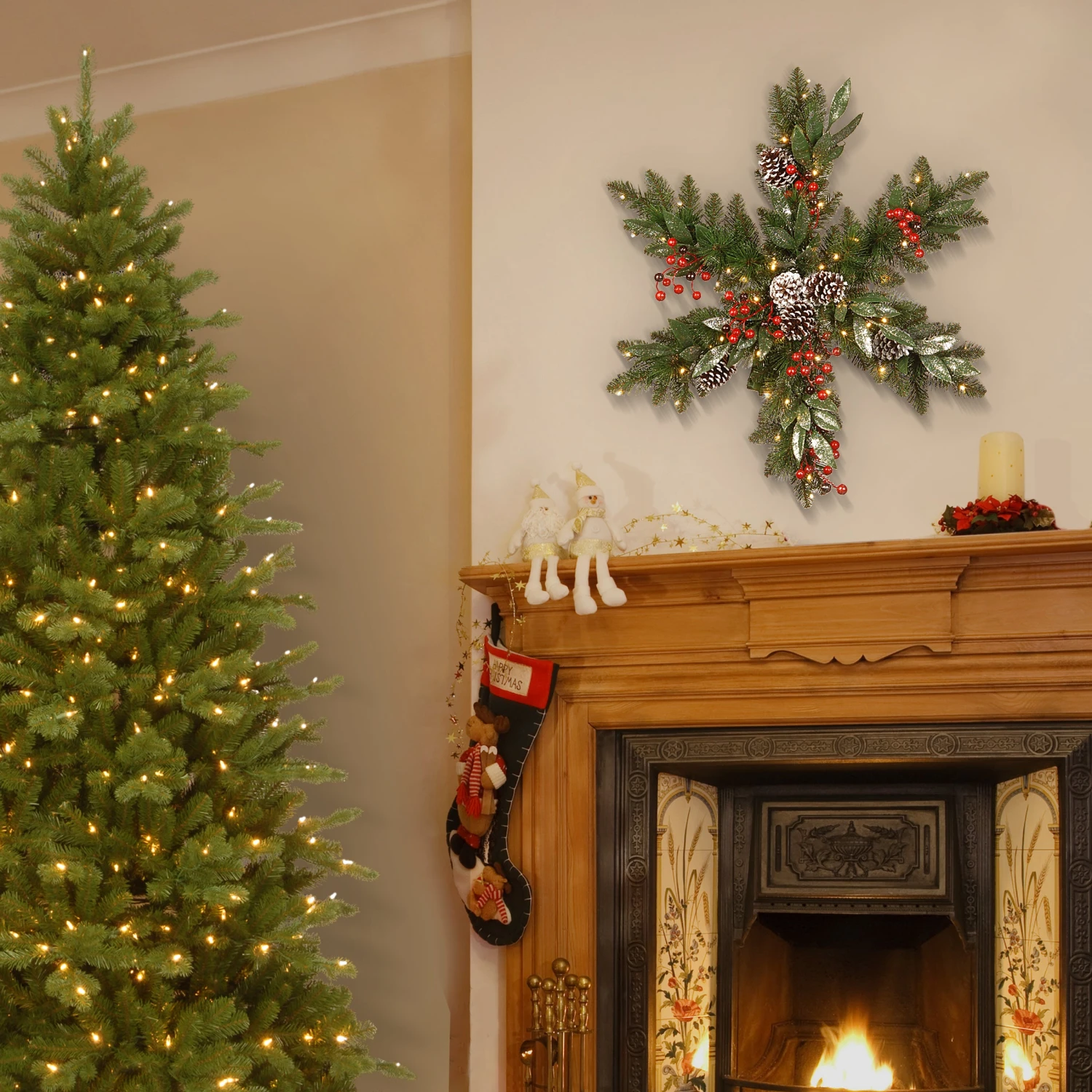 - Designed with a Frosted Berry Pine branch base, this pre-lit artificial Christmas hanging snowflake is 32 inches long and decorated with pine cones, berry clusters and frosted branches.