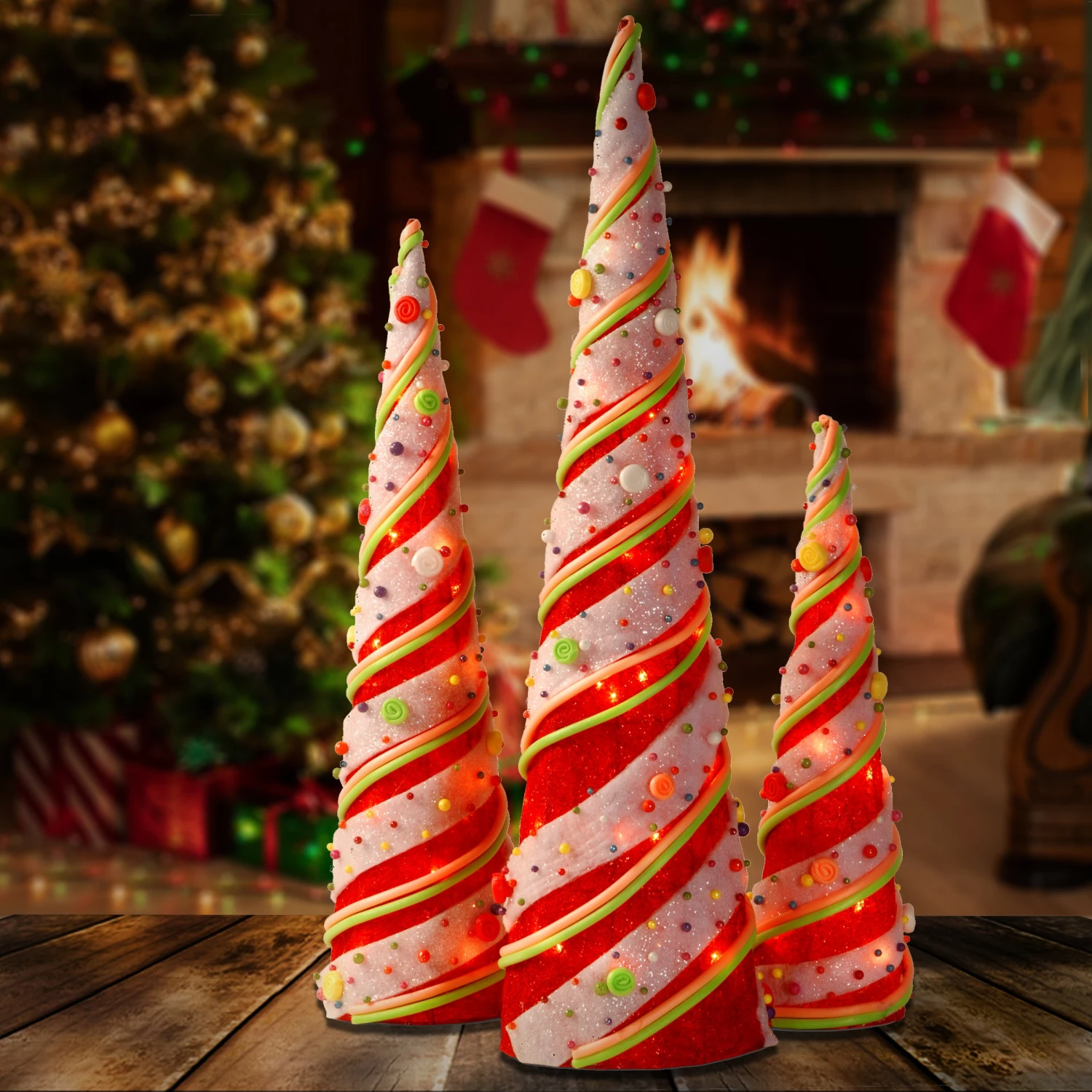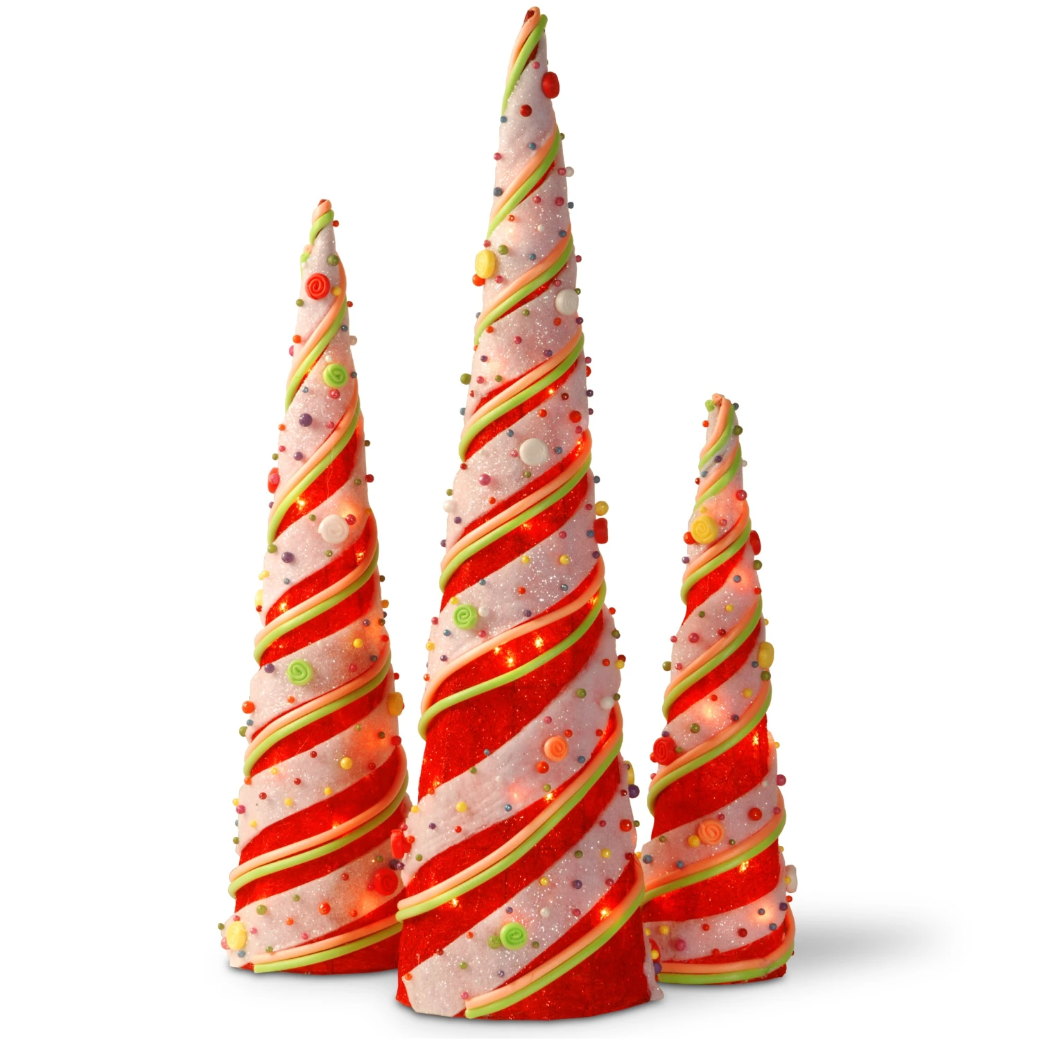 This assortment includes three white foam cones wrapped in red sisal ribbon with green accent and dotted with colorful buttons. Cones sizes are 39”, 31”, and 24” in height. Each is pre-lit from inside with clear lights that add a soft glow. Display this sparkling holiday decoration in indoor or covered outdoor locations.